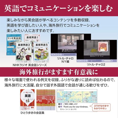 楽しみながら英会話が学べるコンテンツを多数収録。英語を学び直したい人や、海外旅行でコミュニケーションを楽しみたい人におすすめのコンテンツを多数搭載。■付属品:タッチペン1本 単3形アルカリ乾電池2本